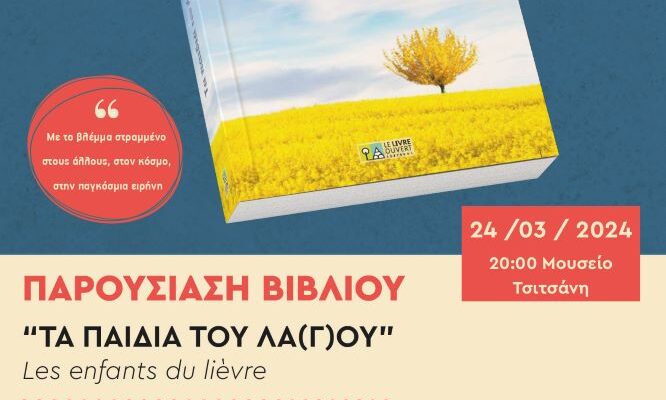 Με το βλέμμα στραμμένο στους άλλους, στον κόσμο, στην παγκόσμια ειρήνη παρουσιάζεται το βιβλίο «Τα παιδιά του λα(γ)ού» (Les enfants du lièvre) την Κυριακή 24 Μαρτίου 2024 και ώρα 20:00 στην αίθουσα εκδηλώσεων του Μουσείου Τσιτσάνη. Το βιβλίο βρίσκεται ήδη στη δεύτερη έκδοσή του και συγγραφέας είναι ο κ. Νικόλαος Χριστοδούλου, διδάκτορας Γαλλικής Λογοτεχνίας και πολιτισμού, διευθυντής εξετάσεων του Γαλλικού Ινστιτούτου Ελλάδας, Πρόεδρος Ακαδημαϊκού Φοίνικα Γαλλίας στην Ελλάδα. Η εκδήλωση οργανώνεται από τις κ. Σοφία Χειράκη, μέλος των Ακαδημαϊκών Φοινίκων και Αρετή Φάη, καθηγήτρια Γαλλικών, και τους φορείς Livre Ouvert και AMOPA, υπό την αιγίδα Περιφέρειας Θεσσαλίας – ΠΕ Τρικάλων, Δήμου Τρικκαίων – Μουσείου Τσιτσάνη