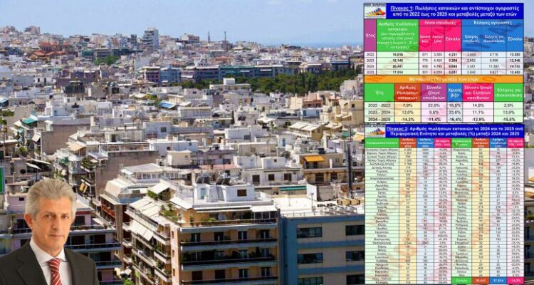 Στον πίνακα 1 που ακολουθεί απεικονίζονται οι αριθμοί πωλήσεων κατοικιών από το 2022 έως το 2025, στις οποίες δεν περιλαμβάνονται οι κατοικίες από γονική παροχή ή δωρεά Α΄, Β΄ και Γ΄ κατηγορίας, οι αντίστοιχοι αγοραστές, είτε ξένοι (χρυσή βίζα και λοιποί), είτε Έλληνες (επενδυτές και αγοραστές για ιδιοκατοίκηση) και οι αντίστοιχες μεταβολές μεταξύ των ετών. Για το 2025 τα διαθέσιμα στοιχεία ήταν μέχρι και τον Οκτώβριο και έγινε εκτίμηση για όλο το έτος, ώστε να γίνει σύγκριση με τα άλλα έτη.