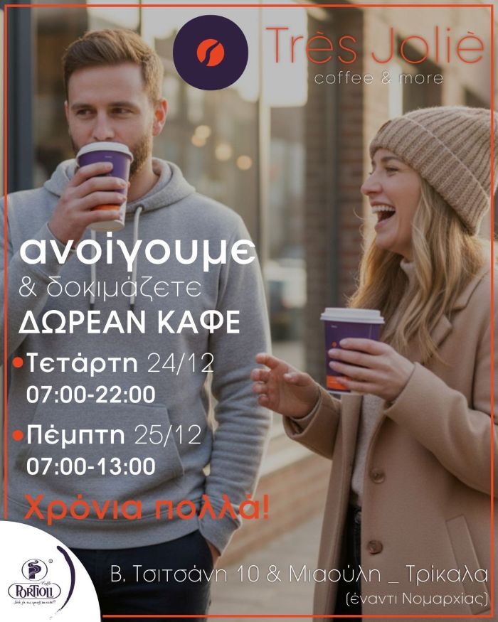 Πρόκειται για το νέο café Tres Jolie, στη γωνία των οδών Μιαούλη και Βασίλη Τσιτσάνη. Ανοίγει σήμερα παραμονή των Χριστουγέννων και σας προσφέρει εντελώς δωρεάν τον καφέ της επιλογής σας.