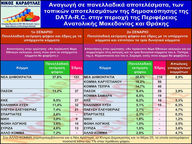 ✔ Λαμβάνοντας υπόψη τα πανελλαδικά αποτελέσματα των εθνικών εκλογών του Ιουνίου 2023 και τα αντίστοιχα αποτελέσματα στην Περιφέρεια Ανατολικής Μακεδονίας και Θράκης, υπολογίσθηκαν συντελεστές αναγωγής και στη συνέχεια έγινε αναγωγή των αποτελεσμάτων της DATA-R.C. σε πανελλαδικό επίπεδο.