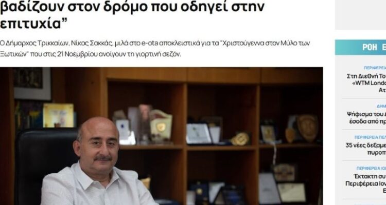 Συνέντευξη στην ιστοσελίδα e-ota.gr για τον Μύλο των Ξωτικών και το συνολικό εγχείρημα, παραχώρησε ο Δήμαρχος Τρικκαίων Νίκος Σακκάς. Η δημοσιογράφος κ. Ειρήνη Μουστακαριά έθεσε ερωτήματα συνολικά για τη διοργάνωση, την προετοιμασία, τον ρόλο της στην κοινωνία των Τρικάλων.