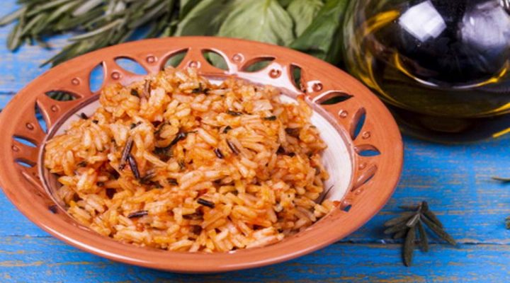 Σε ένα βαθύ τηγάνι βάζουμε το μισό από το λάδι και τα κρεμμύδια κομμένα σε ροδέλες. Ανακατεύουμε για λίγο ώσπου να μαραθούν και προσθέτουμε τις ντομάτες τριμμένες στον τρίφτη. Προσθέτουμε το αλάτι , το πιπέρι το βασιλικό και το σκόρδο. Σε ένα ταψί ρίχνουμε το ρύζι λίγο αλάτι και λίγο λάδι.