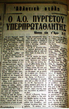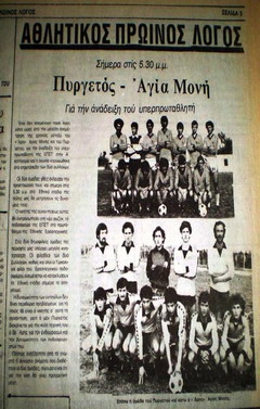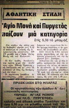 Μια μέρα σαν σήμερα, ακριβώς πριν από 34 χρόνια, στις 25 Μαΐου 1983, διεξήχθη στο τότε Εθνικό στάδιο Τρικάλων, ο αγώνας μπαράζ για την άνοδο στην Εθνική ερασιτεχνική κατηγορία, ανάμεσα σε δύο ιστορικές ομάδες του νομού, τον «Άρη» Αγίας μονής και τον Α.Ο. Πυργετού, που την σεζόν 1982-83 και οι δύο αγωνίζονταν στην Α’ ερασιτεχνική του τοπικού πρωταθλήματος.