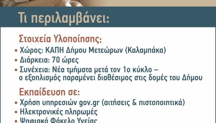 Ο Δήμος Μετεώρων, επενδύοντας σταθερά στην κοινωνική συνοχή και την ισότιμη πρόσβαση όλων των πολιτών στις νέες τεχνολογίες, ανακοινώνει την έναρξη του καινοτόμου προγράμματος «Ψηφιακή Εκπαίδευση και Ενδυνάμωση των Ηλικιωμένων, ηλικίας 65 ετών και άνω».