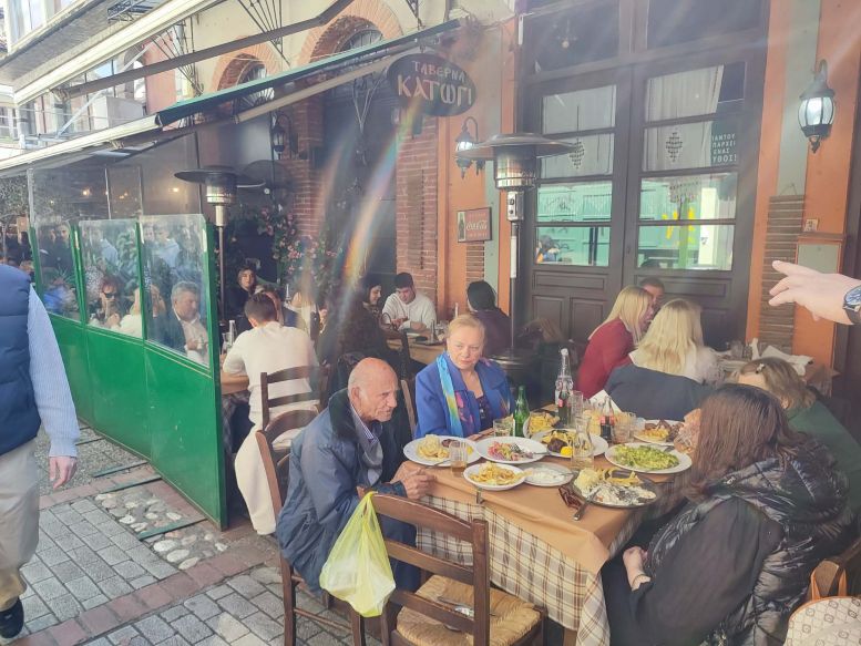 Το μεσημέρι της ημέρας της εθνικής εορτής, όποιος δεν είχε κάνει κράτηση σε κάποια ταβέρνα, ουζερί ή καφετέρια, ήταν αδύνατον να βρει τραπέζι και καρέκλα ελεύθερα.  Μπορεί να υπάρχει ακρίβεια, μπορεί να φωνάζουμε και να διαμαρτυρόμαστε για έλλειψη χρημάτων, αλλά όλα κι όλα, οι παραδόσεις είναι για να τηρούνται και ο Έλληνας και ειδικά ο Τρικαλινός ξέρει να τις τηρεί!