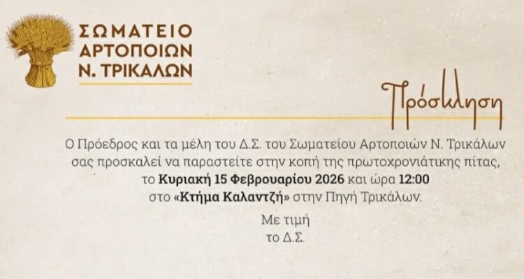 Οι αρτοποιοί των Τρικάλων κόβουν την πίτα τους 13/02/2026 Απόψεις Δημήτρης Παδιός Την πρωτοχρονιάτικη πίτα του κόβει την Κυριακή 15 Φεβρουαρίου και ώρα 12 το μεσημέρι, το σωματείο αρτοποιών νομού Τρικάλων. Η κοπή της πίτας θα γίνει στο ” Κτήμα Καλαντζή”, στην Πηγή Τρικάλων. Slider Posts Τρίκαλα: Η Τσικνοπέμπτη που χάθηκαν οι πολιτικοί (εκτός από τις ψησταριές) 13.02.2026 Συνάντηση Κουρέτα-Βενιζέλου στη Λάρισα με «κοινή οπτική» για το μέλλον της Θεσσαλίας 13.02.2026 Καλαμπάκα: Kάλεσμα στις 28/2/2026 στην συγκέντρωση στον ΟΣΕ για την Χρύσα, την Θώμη και την Αναστασία 13.02.2026 Ειδήσεις σήμερα Εφυγε από τη ζωή ο Επαμεινώνδας Παπαναγιώτου 13.02.2026 Πρωτοπρεσβύτερος Ηρακλής Φίλιος: Για τον έρωτα των νέων 13.02.2026 Σε αθλητική αποσύνθεση ο Δήμος Πύλης! 13.02.2026 Δείτε όλες τις τελευταίες Ειδήσεις από την Ελλάδα και τον Κόσμο, τη στιγμή που συμβαίνουν, στο trikalain.gr
