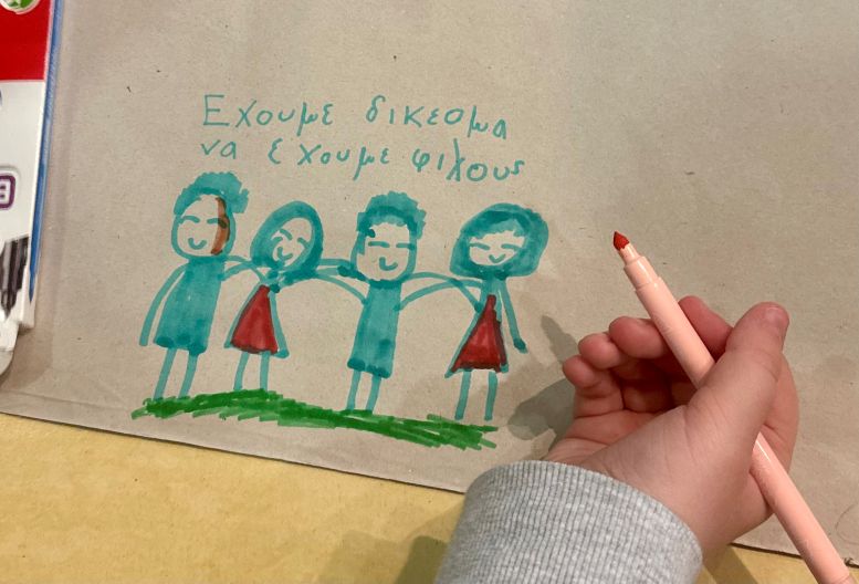Στη συνέχεια, οι μικροί μαθητές συμμετείχαν σε σχετικές δραστηριότητες, δημιουργώντας ομαδικά εικαστικά έργα που έγιναν η «φωνή» τους, αποτυπώνοντας σημαντικά μηνύματα για τη φροντίδα και την προστασία των παιδιών. Η φράση «Όσο διαφορετικοί είμαστε, τόσο μοιάζουμε» ξεχώρισε ως κεντρικό μήνυμα. Ιδιαίτερη εντύπωση προκάλεσαν ο «Κύκλος της Ασφάλειας» και η «Κάρτα Ηρωισμού», επιμελημένα από τους μικρούς υπερασπιστές των δικαιωμάτων.