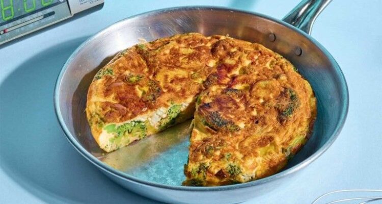 - Περιχύνουμε με το μείγμα των αυγών τα λαχανικά και τηγανίζουμε μέχρι να ροδίσει η κάτω πλευρά και να σφίξει το μείγμα.