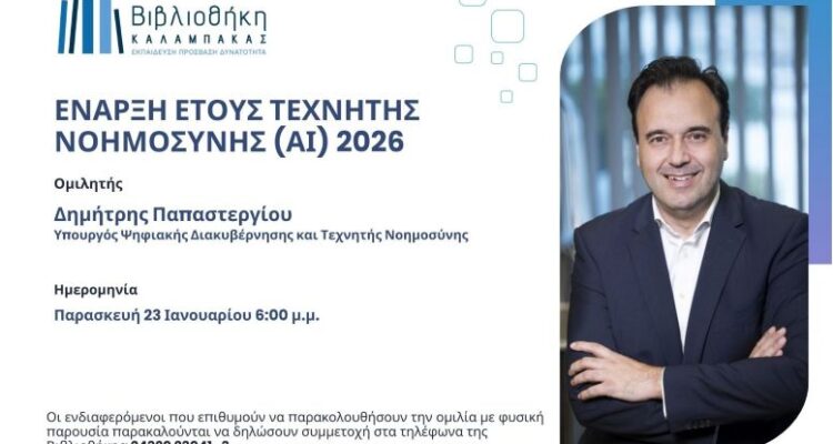 Η Βιβλιοθήκη έχει την τιμή να φιλοξενήσει τον Υπουργό Ψηφιακής Διακυβέρνησης και Τεχνητής Νοημοσύνης, κ. Δημήτρη Παπαστεργίου, σε ομιλία που θα πραγματοποιηθεί την Παρασκευή 23 Ιανουαρίου 2026, στις 6:00 μ.μ., στο πλαίσιο του προγράμματος «Έτος Τεχνητής Νοημοσύνης 2026» που διοργανώνει η Βιβλιοθήκη.
