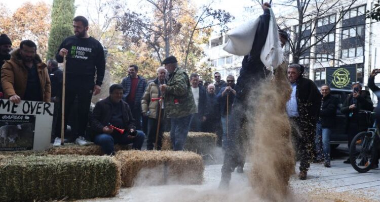 Λίγο μετά τις 12 το μεσημέρι οι κτηνοτρόφοι με αγροτικά οχήματα έφτασαν στην Κεντρική Πλατεία και μπροστά από το Δικαστικό Μέγαρο της Λάρισας έριξαν γάλα, ζωοτροφές και μπάλες με άχυρο, δηλώνοντας την αγανάκτηση τους.