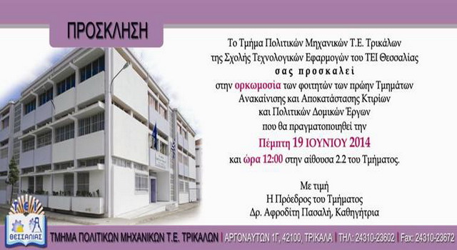 Ορκωμοσία των φοιτητών των πρώην Τμημάτων ανακαίνισης και αποκατάστασης κτιρίων και πολιτικών δομικών έργων θα πραγματοποιηθεί την Πέμπτη 19 Ιουνίου και ώρα 12:00 στην αίθουσα του τμήματος,σύμφωνα με την πρόσκληση του τμήματος Πολιτικών Μηχανικών Τ.Ε. Τρικάλων της Σχολής Τεχνολογικών Εφαρμογών ΤΕΙ Θεσσαλίας.