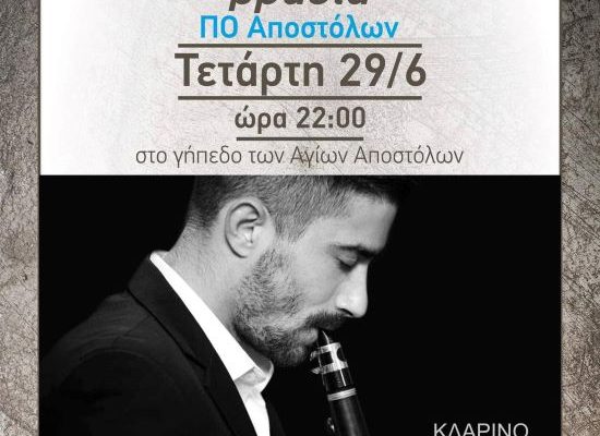 Ο ΠΟ Αγίων Αποστόλων διοργανώνει στο γήπεδο της ομάδας, την Τετάρτη 29 Ιουνίου στις 22.00 μ.μ. μια μοναδική δημοτική και λαϊκή βραδιά για όλους, με την ορχήστρα του μοναδικού δεξιοτέχνη του κλαρίνου Γιώργου Γιαννούλα.