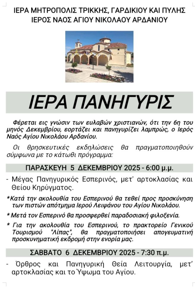 Πανήγυρις Ιερού Ναού Αγίου Νικολάου Αρδανίου 04/12/2025 Δελτία Τύπου Δημήτρης Παδιός Πανήγυρις Ιερού Ναού Αγίου Νικολάου Αρδανίου Ειδήσεις σήμερα Στον Κόμβο του Ε65 ο Περιφερειάρχης Θεσσαλίας Δημήτρης ΚουρέταςΨήφισμα του Δημοτικού Συμβουλίου Δήμου Μετεώρων υπέρ του δικαίου αγώνα των αγροτώνΓιώργος Παπασίμος: Η «Ιθάκη» και ο δύσβατος δρόμος της Ελλάδος Δείτε όλες τις τελευταίες Ειδήσεις από την Ελλάδα και τον Κόσμο, τη στιγμή που συμβαίνουν, στο trikalain.gr