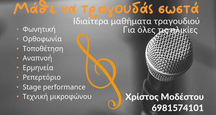 Παραδίδονται μαθήματα τραγουδιού στα Τρίκαλα από τον Χρίστο Μοδέστου. Τα μαθήματα απευθύνονται σε άτομα όλων των ηλικιών, που ενδιαφέρονται να ασχοληθούν επαγγελματικά ή ερασιτεχνικά με το τραγούδι, να εισαχθούν σε δραματικές σχολές, ή να βελτιώσουν τον τρόπο χρήσης της φωνής τους.