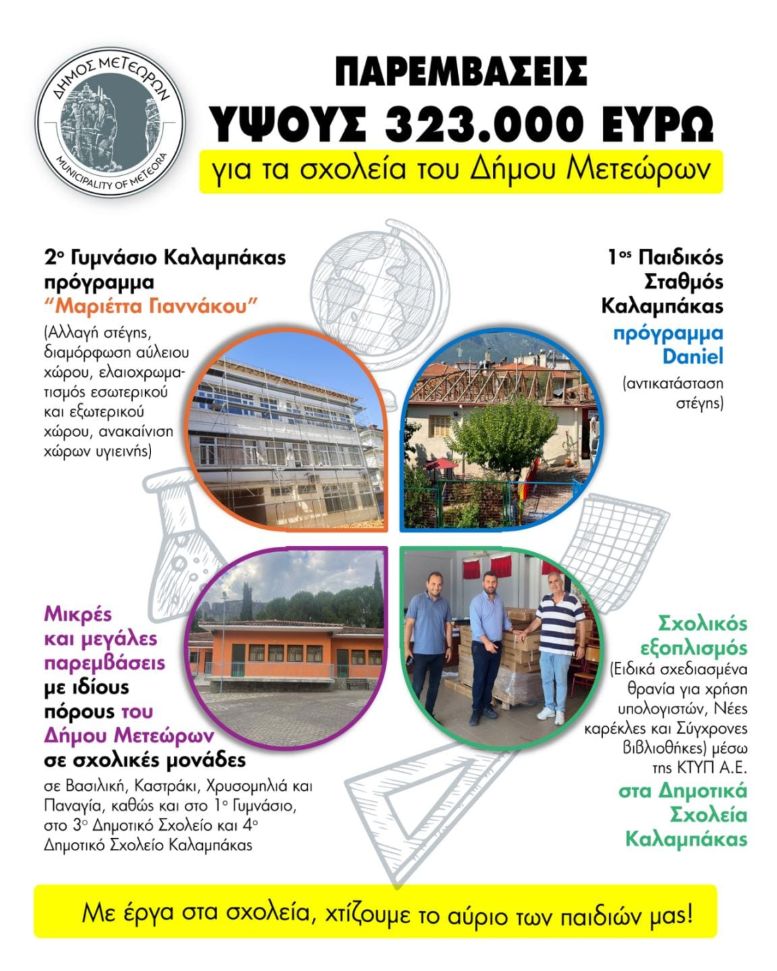 Ο Δήμος Μετεώρων, με στόχο τη βελτίωση της σχολικής καθημερινότητας και την ασφάλεια των μαθητών, προχωρά σε παρεμβάσεις συνολικού ύψους 323.000 ευρώ σε σχολικές μονάδες της περιοχής.