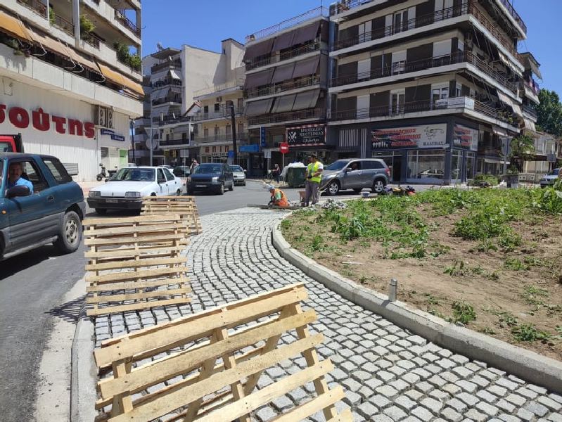Όπως κατέγραψε σήμερα το trikalaIN.gr, η σειρά των νέων παρεμβάσεων αφορούσε στην τοποθέτηση πλακών περιμετρικά του νέου κόμβου, ενώ γίνεται και η τοποθέτηση πλακών και στα γειτονικά πεζοδρόμια.