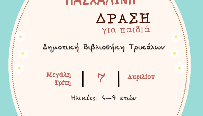 Το Δημοτικό Συμβούλιο Νέων Τρικάλων διοργανώνει πασχαλινή δράση για παιδιά, η οποία θα πραγματοποιηθεί τη Μ. Τρίτη 7 Απριλίου 2026, τις ώρες 11:00 έως 13:00, στον χώρο της Δημοτικής Βιβλιοθήκης Τρικάλων.