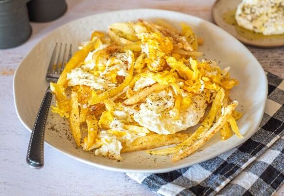 - Ανακατεύουμε απαλά για περίπου 2 λεπτά, μέχρι να γίνουν τα αυγά και να κολλήσουν πάνω στις πατάτες.