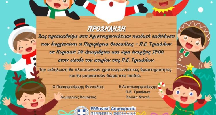 Η Περιφέρεια Θεσσαλίας – Π.Ε. Τρικάλων σας προσκαλεί στη Χριστουγεννιάτικη παιδική εκδήλωση που θα πραγματοποιηθεί την Κυριακή 14/12/2025 και ώρα 17:00 μ.μ. στην είσοδο του κτιρίου της Π.Ε. Τρικάλων.