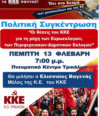 Πιο δυνατό το ΚΚΕ παντού σημαίνει πιο αποτελεσματική πάλη του λαού και της νεολαίας. Περισσότεροι κομμουνιστές εκλεγμένοι σημαίνει περισσότερα εμπόδια στην εφαρμογή της πολιτικής των κυβερνήσεων και της ΕΕ και λιγότερα εμπόδια στον καθημερινό αγώνα των εργαζομένων. Σημαίνει έγκαιρη αποκάλυψη αντιλαϊκών μέτρων που προωθούνται στα Δημαρχεία, στις Περιφέρειες, στο Ευρωκοινοβούλιο.