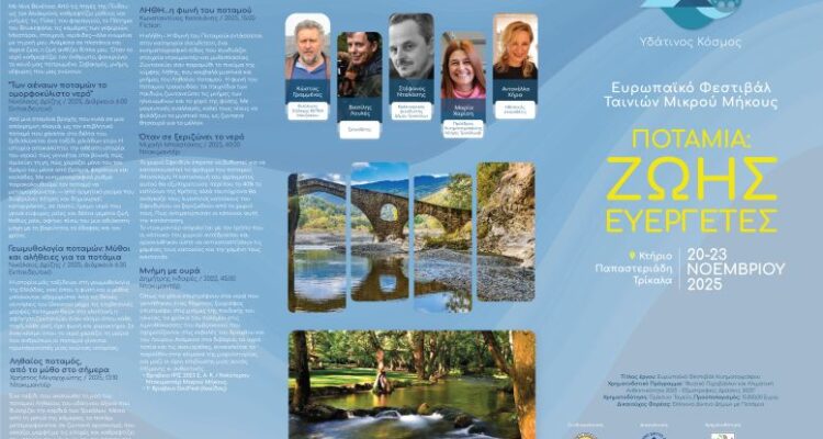 Το Ελληνικό Δίκτυο Δήμων με Ποτάμια, σε συνεργασία με τον Δήμο Τρικκαίων και χρηματοδότηση του Πράσινου Ταμείου, ανοίγει επίσημα στα Τρίκαλα από τις 20 έως τις 23 Νοεμβρίου 2025 τις πύλες του Ευρωπαϊκού Φεστιβάλ Ταινιών Μικρού Μήκους “Υδάτινος Κόσμος”.