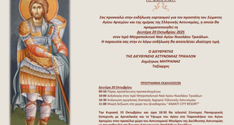 Την Δευτέρα 20 Οκτωβρίου 2025 θα πραγματοποιηθεί ο εορτασμός της “Ημέρας της Ελληνικής Αστυνομίας” και της μνήμης του «Προστάτη του Σώματος Αγίου Αρτεμίου”, στον Ιερό Μητροπολιτικό Ναό του Αγίου Νικολάου Τρικάλων.