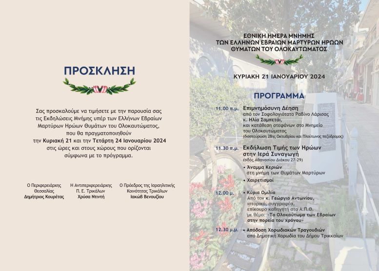 Η Περιφέρεια Θεσσαλίας και η Ισραηλιτική Κοινότητα Τρικάλων καλούν τους Τρικαλινούς συμπολίτες να παρευρεθούν στις εκδηλώσεις για την Εθνική Ημέρα Μνήμης των Ελλήνων Εβραίων Μαρτύρων και Ηρώων Θυμάτων του Ολοκαυτώματος που θα πραγματοποιηθούν στα Τρίκαλα