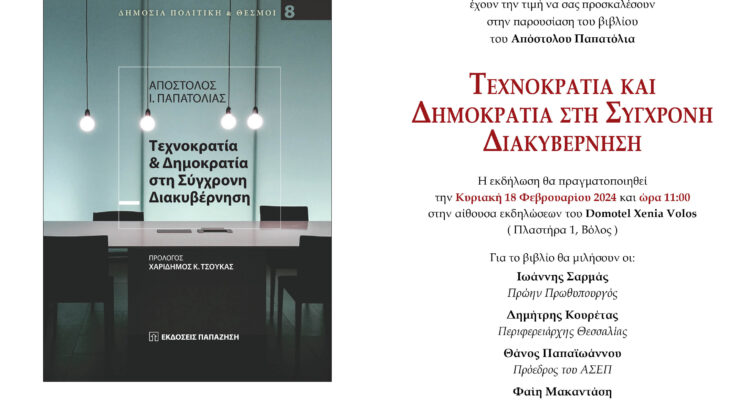 Πρόσκληση για την παρουσίαση του βιβλίου του Απόστολου Παπατόλια «Τεχνοκρατία και Δημοκρατία στη σύγχρονη διακυβέρνηση» με τη συμμετοχή του Περιφερειάρχη Θεσσαλίας, του Προέδρου του ΑΣΕΠ, του πρώην Πρωθυπουργού Ιωάννη Σαρμά και της διευθύντριας του Διανέοσις.