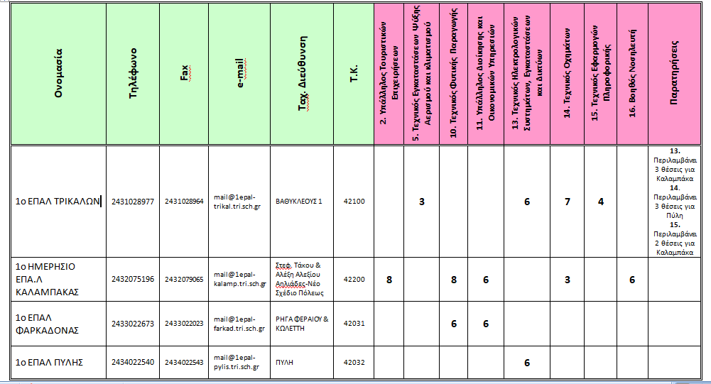 Οι ενδιαφερόμενοι μπορούν να υποβάλουν αιτήσεις από την Τρίτη 3 Οκτωβρίου, ώρα 14.00 έως την Τρίτη 10 Οκτωβρίου, ώρα 14:00 και μπορούν να απευθύνονται στα ΕΠΑ.Λ. του κατωτέρου πίνακα, όπου φαίνονται οι θέσεις και οι ειδικότητες της ΔΔΕ Τρικάλων.