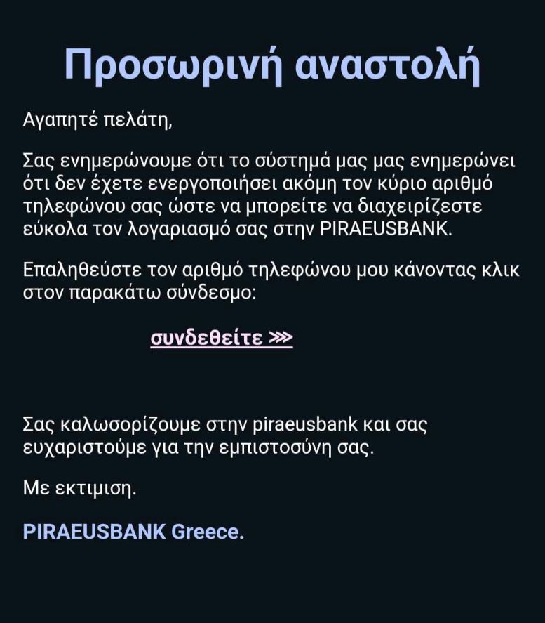 Άγνωστοί επιτήδειοι, προσποιούμενοι τους υπαλλήλους γνωστής ιδιωτικής τράπεζας, στέλνουν μηνύματα σε ανυποψίαστους πολίτες, με σκοπό να τους αποσπάσουν χρήματα.