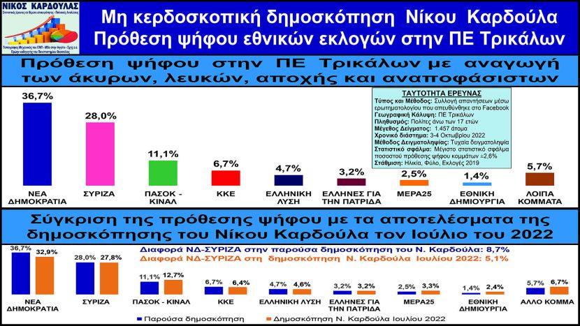 Στη δημοσιότητα έδωσε σήμερα την διαδικτυακή δημοσκόπηση που διενήργησε ο έμπειρος πολιτικός αναλυτής και δημοσκόπος Νίκος Καρδούλας, το διάστημα 3-4 Οκτωβρίου 2022, σε δείγμα 1457 χρηστών του Facebook στη ΠΕ Τρικάλων.