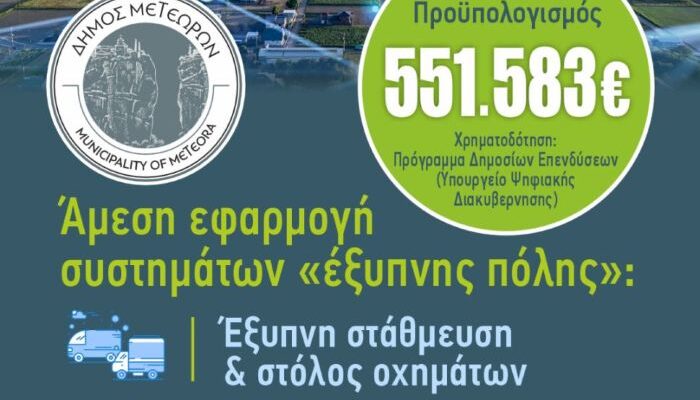 Με απόφαση του Υπουργού Ψηφιακής Διακυβέρνησης Δημήτρη Παπαστεργίου, εντάχθηκε στο Πρόγραμμα Δημοσίων Επενδύσεων το έργο «Δράσεις Ψηφιακού Μετασχηματισμού στο Δήμο Μετεώρων», συνολικού προϋπολογισμού 551.583 €, με χρηματοδότηση από το Υπουργείο Ψηφιακής Διακυβέρνησης. Το έργο αποτελεί ένα ολοκληρωμένο πακέτο παρεμβάσεων «έξυπνης πόλης», που αναβαθμίζει τις ψηφιακές υποδομές και τις παρεχόμενες υπηρεσίες του Δήμου Μετεώρων, με στόχο τη βελτίωση της καθημερινότητας των πολιτών, την ενίσχυση της διαφάνειας και την αποτελεσματικότερη λειτουργία των δημοτικών υπηρεσιών.
