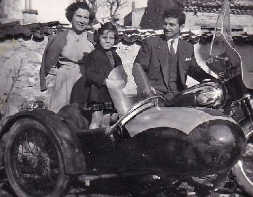 Διακρίνεται ο παλιός Τρικαλινός βιβλιοπώλης Λάμπρος Λαμπρίδης-αείμνηστος πια-να έχει παρκαρισμένη την μηχανή του με καλάθι, στην αυλή του σπιτιού της Αντιγόνης Λιάπη στην οδό Νικοτσάρα. Μαζί του στη φωτογραφία η ξαδέλφη του Διονυσία και η μικρή του ανηψούλα.