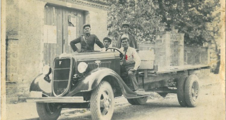 Διακρίνονται καθήμενοι πάνω στο φορτηγάκι εκείνης της εποχής μάρκας Ford, oοδηγός Βασίλειος Κλούφης και ο συνοδηγός του Γεώργιος Μπαμπαλιάρης, να κάνουν μεταφορά κορμών ελάτης από την Τύρνα προς Τρίκαλα για λογαριασμό της εταιρείας ξυλείας του Σωτηρίου Σιούγα.