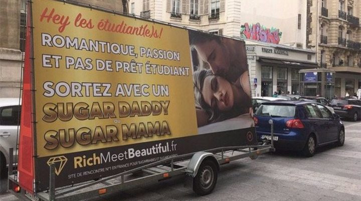 «Γεια σας, φοιτήτριες!» γράφει η γιγαντοαφίσα, πάνω σε ένα φορτηγό, που διαφημίζει στη γαλλική πρωτεύουσα την ιστοσελίδα RichMeetBeautiful. «Ρομαντισμός, πάθος και όχι φοιτητικά δάνεια. Βγείτε ραντεβού με έναν Sugar Daddy, μια Sugar Mama» συνεχίζει η διαφήμιση.