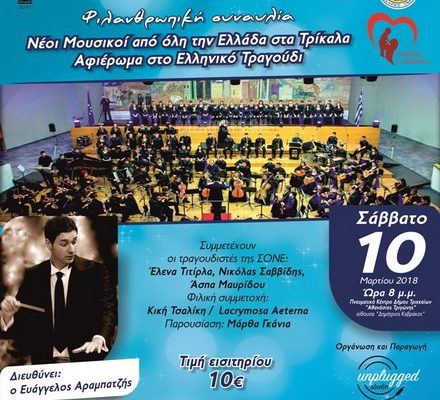 Μεγάλη μουσική βραδιά για φιλανθρωπικό σκοπό στα Τρίκαλα. Ο Πανελλήνιος Σύλλογος «Η Καρδιά του Παιδιού / Child’s Heart» και ο Δήμος Τρικκαίων, διοργανώνουν φιλανθρωπική συναυλία, με τη Συμφωνική Ορχήστρα Νέων Ελλάδος, υπό τη Διεύθυνση του Ευάγγελου Αραμπατζή. Η συναυλία θα δοθεί το Σάββατο 10 Μαρτίου στις 8 το βράδυ στο Πνευματικό Κέντρο του Δήμου Τρικκαίων «Αθανάσιος Τριγώνης» στην Αίθουσα «Δημήτριος Καβράκος».
