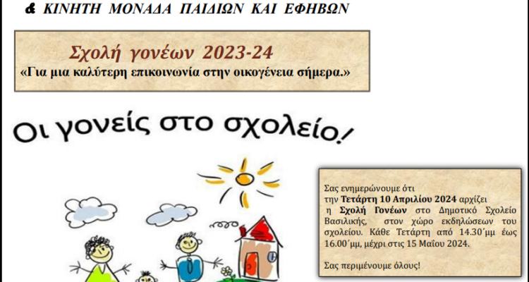 Το ΔΗΜΟΤΙΚΟ ΣΧΟΛΕΙΟ ΒΑΣΙΛΙΚΗΣ σε συνεργασία με την ΚΙΝΗΤΗ ΜΟΝΑΔΑ ΠΑΙΔΙΩΝ ΚΑΙ ΕΦΗΒΩΝ & ΤΟ ΚΕΝΤΡΟ ΗΜΕΡΑΣ ΠΑΙΔΙΩΝ ΚΑΙ ΕΦΗΒΩΝ οργανώνουν και θα υλοποιήσουν ΣΧΟΛΗ ΓΟΝΕΩΝ στον χώρο του σχολείου. Η Σχολή Γονέων θα ξεκινήσει την Τετάρτη 10 Απριλίου 2024. Οι συναντήσεις θα πραγματοποιούνται κάθε Τετάρτη από 14.30΄μμ έως 16.00΄μμ, στην αίθουσα εκδηλώσεων του σχολείου μέχρι στις 15 Μαϊου 2024. Συντονίστριες της ομάδας θα είναι η κα Παναγιωτίδοιυ Δέσποινα, Ψυχολόγος και Οικογενειακή Θεραπεύτρια και η κα Γιώτα Αθηνά, Ψυχολόγος. Στη Σχολή Γονέων θα συζητηθούν θέματα που άπτονται των ανησυχιών και των προβληματισμών των γονέων με στόχο μια καλύτερη επικοινωνία στην οικογένεα σήμερα.