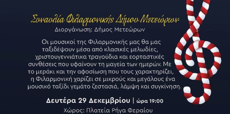 Ο Δήμος Μετεώρων προσκαλεί τους πολίτες και τους επισκέπτες σήμερα, Δευτέρα 29 Δεκεμβρίου, το απόγευμα και ώρα 19:00, στην Πλατεία Ρήγα Φεραίου, στη Χριστουγεννιάτικη Συναυλία της Φιλαρμονικής του Δήμου Μετεώρων.