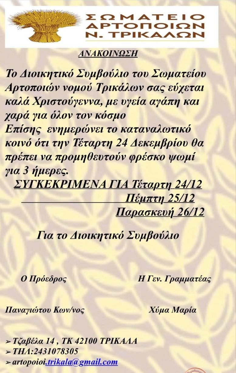 Σωματείο Αρτοποιών Tρικάλων : Ψωμί για τρεις μέρες την παραμονή Χριστουγέννων 23/12/2025 Τοπικά - Θεσσαλικά Δημήτρης Παδιός Ψωμί για 3 ημέρες θα διαθέτουν τα αρτοποιεία των Τρικάλων την Τετάρτη παραμονή των Χριστουγέννων Ειδήσεις σήμερα Χριστουγεννιάτικη στήριξη από την Ενωση Εφοπλιστών σε πλημμυροπαθείς του Δήμου ΤρικκαίωνΧριστουγεννιάτικη φορολοταρία: 100.000 ευρώ σε 12 τυχερούς – Δείτε εάν κερδίσατεΕορταστικό κλίμα στην Περιφέρεια Θεσσαλίας. Ο Δημήτρης Κουρέτας άκουσε κάλαντα από μαθητές και τα μέλη της Χορωδίας του Πολιτιστικού Κέντρου της Δείτε όλες τις τελευταίες Ειδήσεις από την Ελλάδα και τον Κόσμο, τη στιγμή που συμβαίνουν, στο trikalain.gr