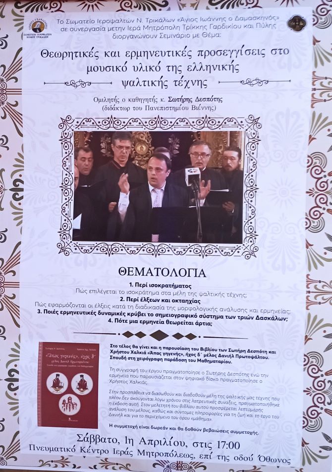 Το Σάββατο 1 Απριλίου 2023 και ώρα 17:00 μ.μ στο Πνευματικό Κέντρο της Ιεράς Μητροπόλεως Τρίκκης Γαρδικίου και Πύλης θα διεξαχθεί επιμορφωτικό σεμινάριο υπό την διοργάνωση του ιστορικού Σωματείου Ιεροψαλτών Ν. Τρικάλων “ΙΩΑΝΝΗΣ Ο ΔΑΜΑΣΚΗΝΟΣ” σε συνεργασία με την Ιερά Μητρόπολη Τρίκκης Γαρδικίου και Πύλης με Θέμα: