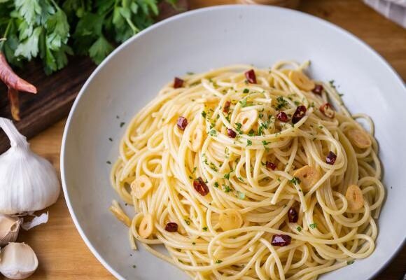 - Για τα σπαγγέτι με σκόρδο, ελαιόλαδο και καυτερή πιπεριά (aglio, olio e peperoncino), σε ξύλο κοπής, με το μαχαίρι, πατάμε ελαφρά τις σκελίδες του σκόρδου να ανοίξουν και αφαιρούμε το πράσινο φύτρο. Ανάλογα πόσο έντονη γεύση σκόρδου θέλουμε να έχει η μακαρονάδα, είτε ψιλοκόβουμε είτε αφήνουμε ολόκληρες τις σκελίδες ώστε να τις αφαιρέσουμε.