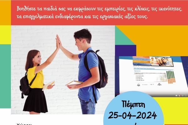 Καλούνται όλοι οι γονείς που έχουν μαθητές/τριες που φοιτούν στην Γ΄ τάξη Γυμνασίου, Α΄ και Β΄ τάξη ΓΕΛ και ΕΠΑ.Λ ώστε να ενημερωθούν και να εκπαιδευτούν στην χρήση αυτού του δωρεάν εργαλείου που βοηθά τους/τις μαθητές/τριες να ανακαλύψουν τις κλίσεις τους, τις ικανότητες, τα επαγγελματικά ενδιαφέροντα και τις εργασιακές αξίες τους.