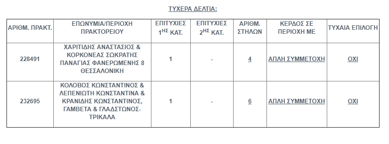 Ο τυχερός ή οι τυχεροί έχοντας δαπανήσει μόλις 3 ευρώ κέρδισαν το ποσό των 400.000 ευρώ παίζοντας το τυχερό δελτίο στο κατάστημα επί της οδού Γαμβέτα και Γλάδστωνος στα Τρίκαλα των κ.κ. Κολοβός Κωνσταντίνος- Λεπενιώτη Κωνσταντίνα- Κρανίδη Κωνσταντίνου.