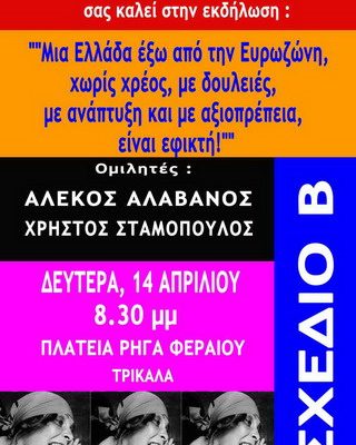 Σήμερα Μ. Δευτέρα 14 Απρίλη ο Αλέκος Αλαβάνος, πρόεδρος του ΣΧΕΔΙΟΥ Β, επισκέπτεται την πόλη μας, προσκαλεσμένος από την τοπική πολιτική κίνηση του κόμματος.