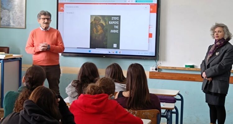 Με τον συγγραφέα συζητήσαμε για τη λογοτεχνία γενικότερα και για τα βιβλία του ειδικότερα, και ιδιαίτερα για το τελευταίο βιβλίο του. Τους μαθητές/τριες οι οποίοι/ες συμμετείχαν στην δράση Φιλαναγνωσίας, ενημέρωσε, οργάνωσε και συντόνισε η Δ/ντρια του σχολείου κ. Ηλιάδη Αμαλία, φιλόλογος-ιστορικός. Στην παρουσίαση συμμετείχαν και οι συνάδελφοι φιλόλογοι Διαμαντή Αριάδνη, Ρίζος Σωτήριος, Καμπλιώνη Αρετή και Τόγια Ευαγγελία.