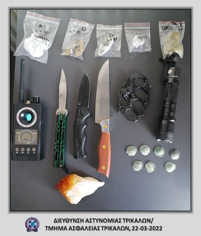Συνελήφθησαν, χθες (21-03-2022) το βράδυ στα Τρίκαλα, από αστυνομικούς της Ομάδας Δίκυκλης Αστυνόμευσης (ΔΙ.ΑΣ.) Τρικάλων, δύο ημεδαποί άνδρες, σε βάρος των οποίων σχηματίστηκε δικογραφία για -κατά περίπτωση- παράβαση της νομοθεσίας περί προστασίας αρχαιοτήτων και εν γένει της πολιτιστικής κληρονομιάς, της νομοθεσίας περί όπλων και της νομοθεσίας περί ναρκωτικών.