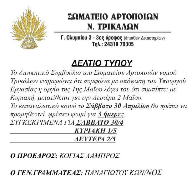 Σύλλογος αρτοποιών Τρικάλων: Ψωμί για 3 ημέρες το Σάββατο 29/04/2022 Τοπικά - Θεσσαλικά Δημήτρης Παδιός Ειδήσεις σήμερα Θλίψη στα Τρίκαλα για το θάνατο του 41χρονου Κωνσταντίνου ΓκιάταInfographic: Οι 10 χώρες που θα πληγούν περισσότερο από κύματα καύσωνα έως το 2100«Συνομωσία» συμφερόντων, Μαξίμου και… Τσίπρα βλέπουν στη Χ. Τρικούπη Δείτε όλες τις τελευταίες Ειδήσεις από την Ελλάδα και τον Κόσμο, τη στιγμή που συμβαίνουν, στο trikalain.gr