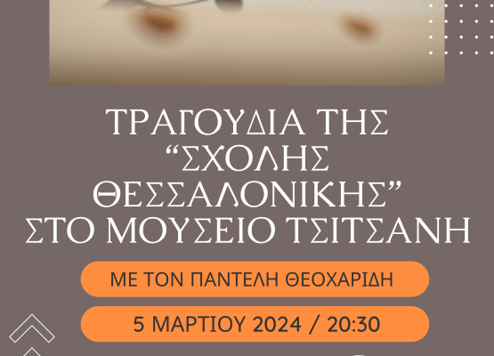 Στο πλαίσιο του ετήσιου προγράμματος εκδηλώσεων του Μουσείου Τσιτσάνη υπό τον τίτλο «Πορτραίτα στο Μουσείο», την Τρίτη 5 Μαρτίου οργανώνεται συναυλία που είναι αφιερωμένη στη «Σχολή της Θεσσαλονίκης»