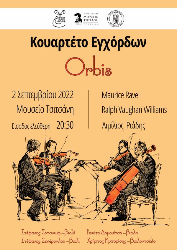 Το Μουσικό σχολείο Τρικάλων σε συνεργασία με το Μουσείο Τσιτσάνη διοργανώνουν συναυλία μουσικής δωματίου με προσκεκλημένους το κουαρτέτο εγχόρδων ORBIS. Το σύνολο αποτελείται από τους Στέφανο Σάτσκωφ και Στέφανο Σεκέρογλου στο βιολί, Ρενάτο Δαμονίτσα στη βιόλα και Χρήστο Κυπαρίση στο βιολοντσέλο.