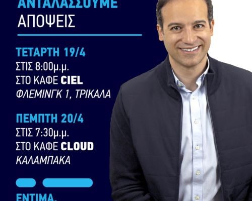 Έτσι λοιπόν για το επόμενο διήμερο έχει προγραμματίσει δύο συναντήσεις με νεολαίους και όχι μόνο σε δύο νεανικά στέκια, ένα στα Τρίκαλα και ένα στη Καλαμπάκα. Αναλυτικά το πρόγραμμα των συναντήσεων του έχει ως εξής: